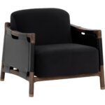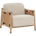 The Calloway Lounge Chair combines robust craftsmanship with inviting comfort. Its solid oak frame is accented with wide Italian leather straps, secured by hand-applied nailheads for a distinctive touch. Generous cushions are upholstered in smooth abbington fabric, while gold-capped feet finish the piece with with a subtle note of polish.