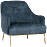 An elegant lounge chair with mid-century modern influence. Designed with a comfortable, single tufted seat and sloping arms. Stocked in a beautiful, velvet-like nono petrol, rust or shitake fabric. Nono fabric features a natural variation of light and dark sections. An exposed gold stainless steel frame and legs complete the look.