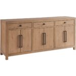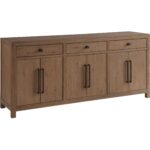 The Canyon Credenza is a stunning blend of mid-century modern design and practical storage. Its light wood finish with dark graining creates a warm and inviting aesthetic. The combination of long steel handles and rounded metal pulls adds a touch of industrial chic, while the ample storage space makes it a functional and stylish addition to any room.