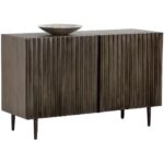 This bold sideboard will command attention through living, lounge and dining spaces. Features a grey mango wood frame with dramatic sculpted details on the face of the two cabinets. Steel legs complete the urban and contemporary look. Made in India. With refined craftsmanship, this design was brought to life by skilled local artisans. By nature, these materials develop unique imperfections such as fissures, markings and colour variations for a truly one-of-a-kind piece. As wood is an organic, porous material, these pieces will contain natural variation of texture and may also exhibit fine indentations and cracks. Wood pieces will also display a disparity of colour and grain, and visible knots and burls that add to the character of each piece.