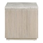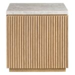 The Carmen Side Table, a striking piece of furniture, combines sleek lines with a unique square silhouette. Its textured, vertical design, reminiscent of natural elements, is juxtaposed with a smooth stone top. This captivating contrast and its versatile design make it a perfect addition to any interior space.