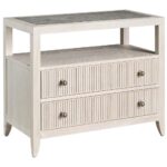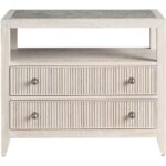 The Carmen Two-Drawer Nightstand is a stylish and functional addition to any bedroom. Its two spacious drawers, adorned with sleek metal ring pulls, offer ample storage for bedside essentials. The open shelf, accented by an inset stone top, adds a touch of luxury and provides a convenient space for displaying books or decorative objects.