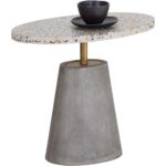 A truly unique end table. This design features a bold concrete base, a brushed brass steel rod and an oval terrazzo top. Terrazzo consists of chips of marble, quartz, granite and glass for a unique look; no two pieces are alike, and colours and/or patterns will vary. Crafted from a natural concrete mix, each piece will look different. Variations in colour, texture, imperfections, surface scratches and non-structural hairline cracks are considered inherent and valued qualities of the material.