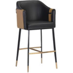 A unique barrel back barstool from upholstered in supple napa beige faux leather and accented with a contrasting exterior in napa tan faux leather. Finished with black steel legs and copper foot caps. Suitable for residential and commercial spaces. Handle With Care: This design has been crafted with faux leather. Faux leather is manufactured to reflect the natural characteristics of leather; as such, colour variations, markings wrinkles, grooves, and light scratches are appreciated characteristics. No two pieces will be alike.