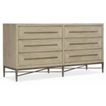 - Finish: Terrain: a soft, taupe finish on oak veneers. Distressing includes dry brushing. Champagne colored bar pull hardware and metal base.