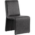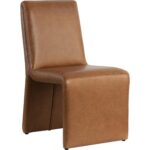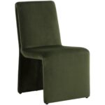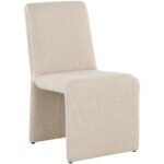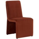 Create an alluring dining space with this modern dining chair that features an intriguing silhouette. Stocked in effie linen fabric with a fully upholstered wooden base. Also available in meg rust and moss green fabrics.