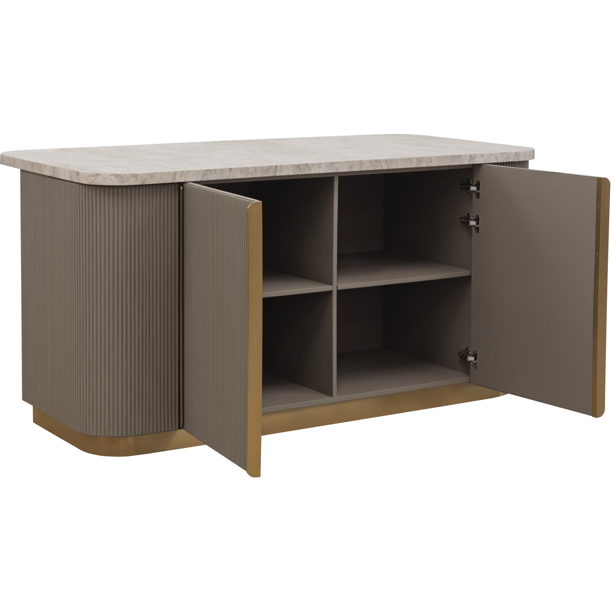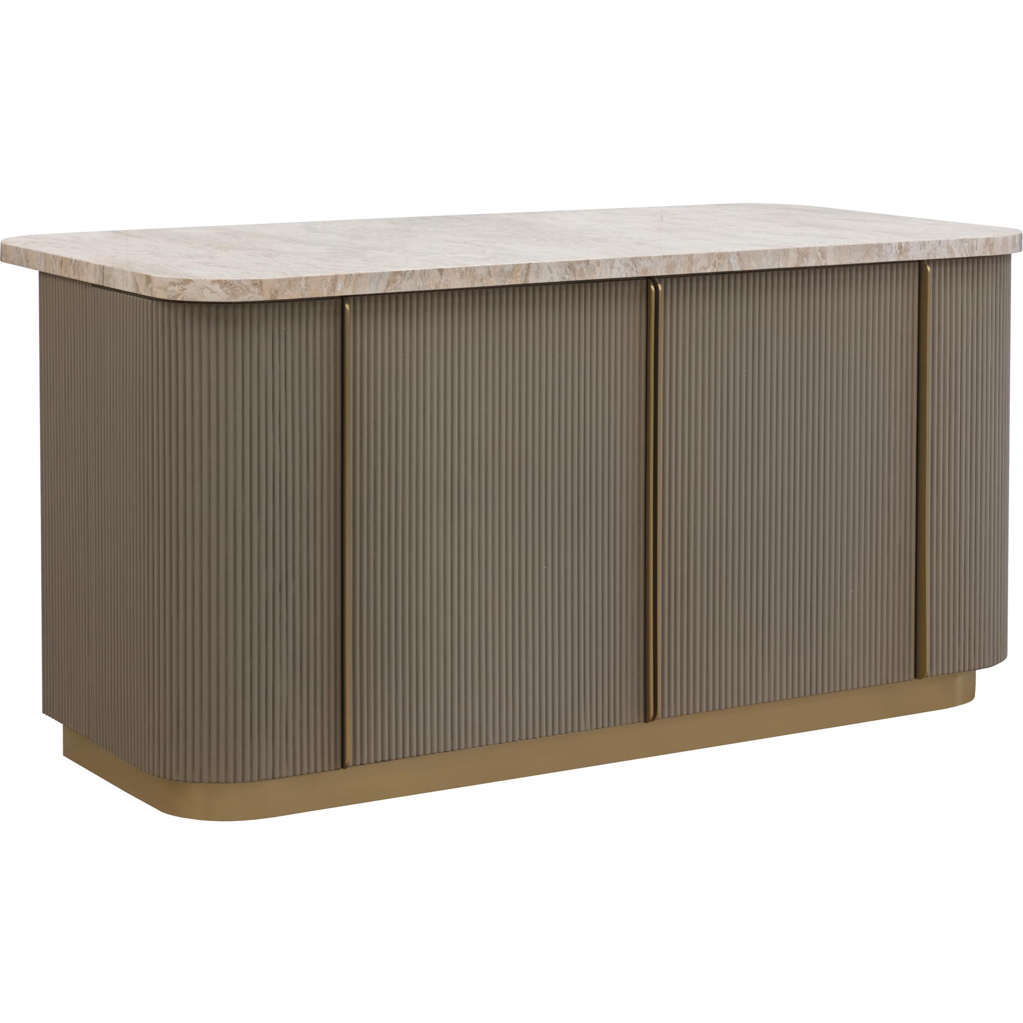 The Cataldi Kitchen Island brings a tactile elegance to the kitchen. A stark marble top rests above fluted panels wrapped in soft taupe faux leather, offering a subtle play of texture and tone. Inside, matching leather-lined shelving offers discreet storage, while brushed gold accents add a polished touch. Designed with versatility in mind, Cataldi can stand alone as a kitchen prep station, receptionist desk, or be paired with multiples as a stylish workspace.