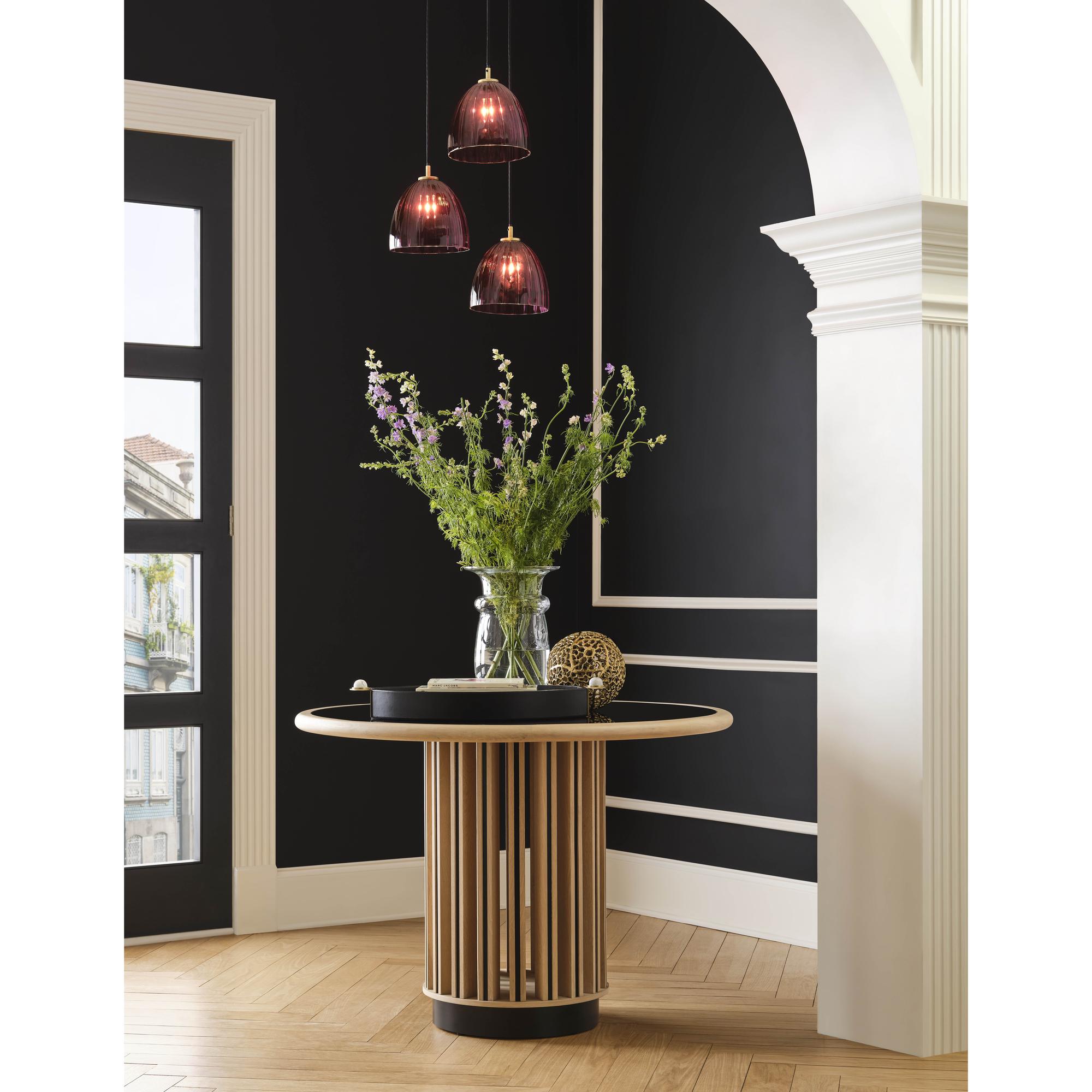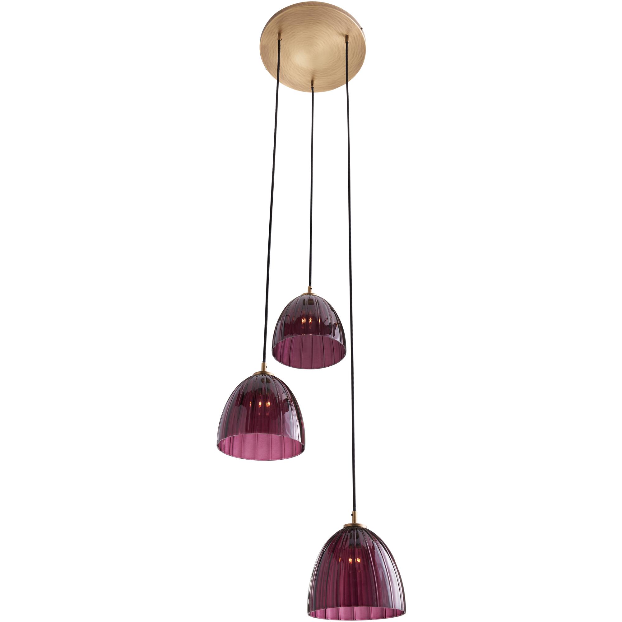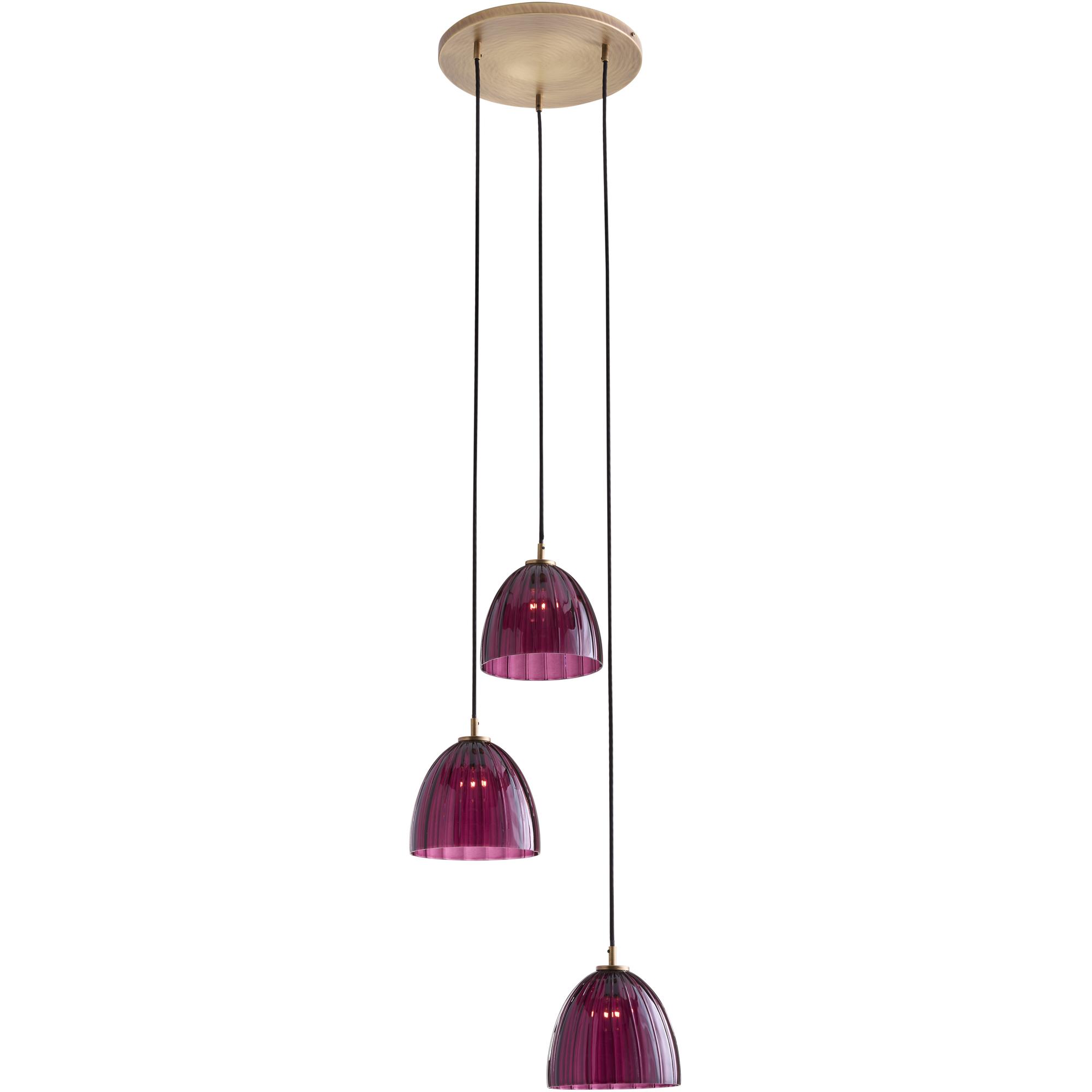 The Caterina Triple Pendant in Aubergine offers a refined, sculptural presence with its trio of mouth-blown Italian glass shades. Featuring a softly fluted design in a rich purple tone, each pendant hangs at staggered heights from a warm brass canopy, creating a dynamic and elegant display.