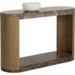 The Cavette Console Table combines old world influence with feminine flair. Features a ridged concrete top and base in a dark emperador marble-like finish and completed with a brass steel frame.