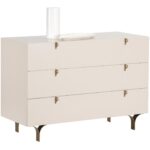 Add beauty to your bedroom oasis with this stylish dresser. Designed with three drawers crafted from rubberwood, featuring a subtle wood grain and a painted cream finish. Uniquely sculpted antique brass feet and drawer pulls complete the look. As wood is an organic, porous material, these pieces will contain natural variation of texture and may also exhibit fine indentations and cracks. Wood pieces will also display a disparity of colour and grain, and visible knots and burls that add to the character of each piece.