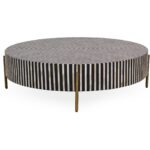 Simplistic and bold, the Chameau coffee table is an exercise in contrast, featuring a hypnotic art deco design. Simple construction and a delicate brass-finished base set off a veneer of white and black camel bone and resin, making a spellbinding visual statement. The Chameau series features a coffee table in three sizes and a side table perfect for any living space.