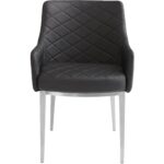 This sleek and classic dining armchair features brushed stainless steel legs with a diamond tufted seat and back. Stocked in black faux leather. Sits beautifully. Handle With Care: This design has been crafted with faux leather. Faux leather is manufactured to reflect the natural characteristics of leather; as such, colour variations, markings, wrinkles, grooves, and light scratches are appreciated characteristics. No two pieces will be alike. Visit our Product Care page for more information on how to ensure the lasting beauty of this piece.