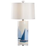 Ceramic lamp with hand painted sailboat designs in blue tones on an acrylic mount. Colors may vary. Designed by Jamie Merida.