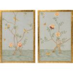 Wooden panel with hand painted chinoiserie scene framed in gold molding.