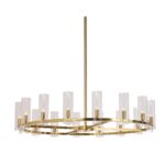 Brighten up any space with this large, sophisticated chandelier that invokes timeless elegance. Crafted with a metal wheel frame in a brass finish and features clear glass cylinder shades. Also available in a small version.