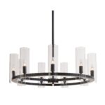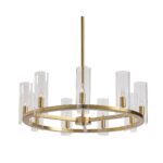 Brighten up any space with this large, sophisticated chandelier that invokes timeless elegance. Crafted with a metal wheel frame in a brass finish and features clear glass cylinder shades. Also available in a large version.