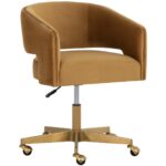 Boasting a mesmerizing curvy design, this modern office chair also features a stylish cutout on the seatback. Stocked in deep green and gold sky fabrics. Completed with a gold stainless steel base and castors for mobility.