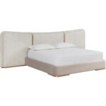 The Clarimond Bed is an interplay of texture and form. Its sweeping three-panel headboard is upholstered in richly textured boucle fabric, detailed with brushed gold stainless steel bands for a subtle shimmer. The low, rounded frame is upholstered in smooth fabric that contrasts beautifully with the tactile headboard.