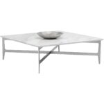 Chic and elegant, this spectacular coffee table features a brushed stainless steel base with a beveled white marble layer top. Each piece is uniquely marked with grey veining. As marble is a natural material, unique veining, pitting, fissures, micro-cracks and colour variations are all characteristics that add to the uniqueness and beauty of each piece.