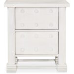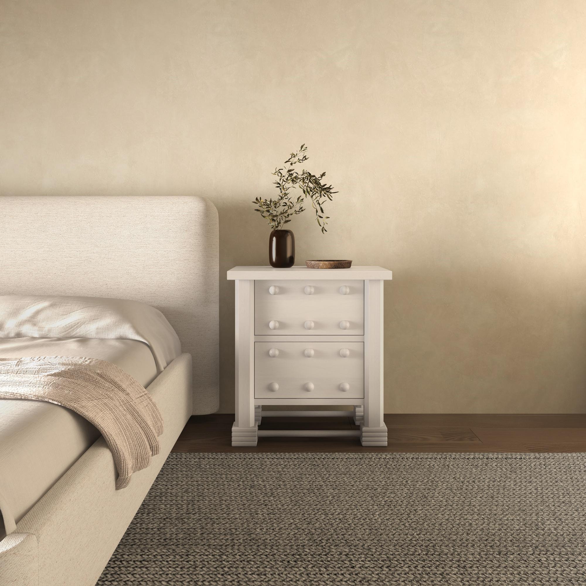 French-inspired elements and circular motifs enrich the Clement nightstand’s oversized, chunky design. Crafted from mango wood with a whitewash finish, this ornate piece features carved detail feet with stretcher bars and drawer storage.