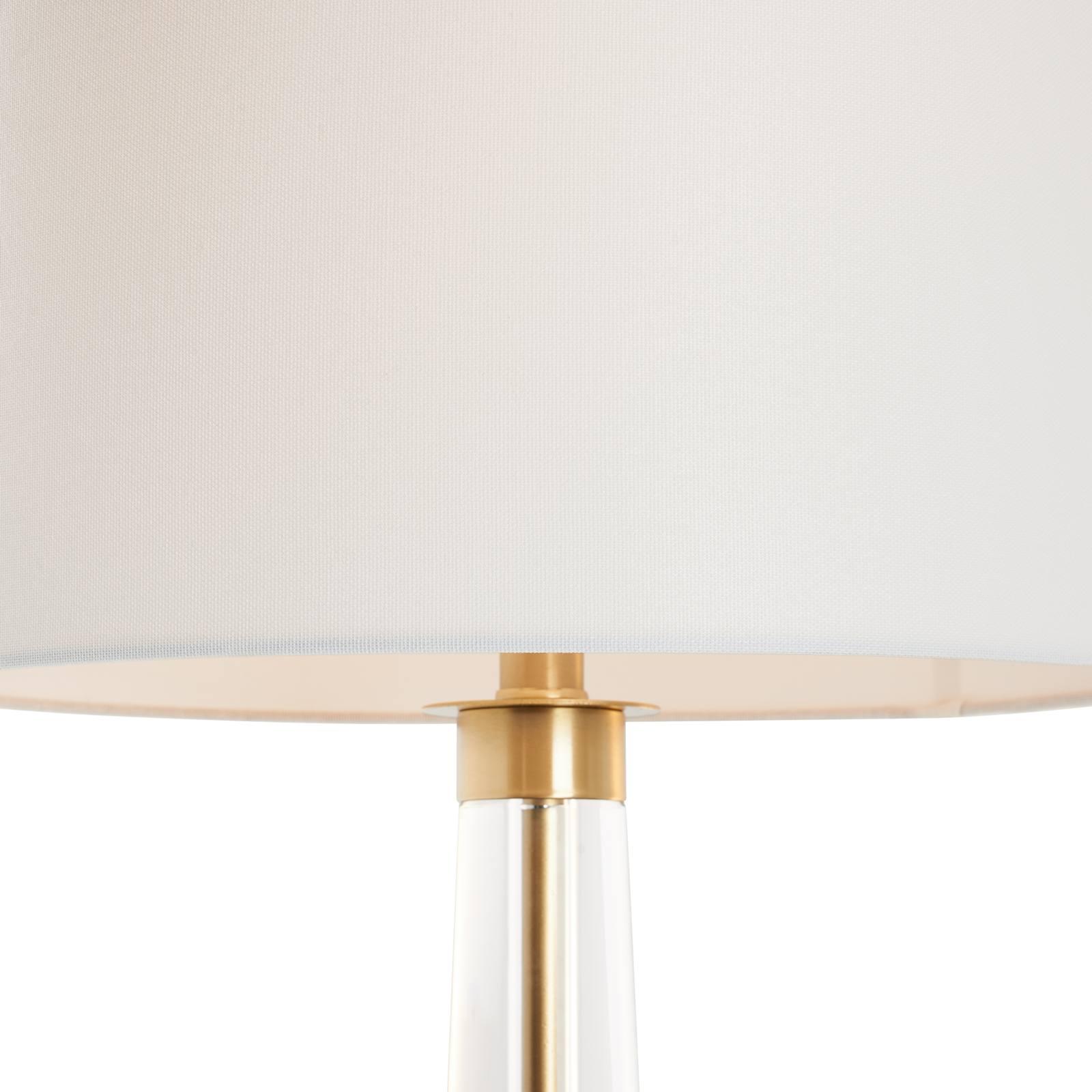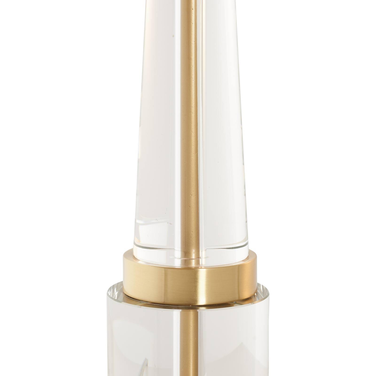 The Cleo Table Lamp exudes modern luxury with its sleek tapered crystal base accented by warm antique brass details. Its clear, sculptural form reflects light beautifully, while the crisp white drum shade adds a touch of refinement. Perfect for contemporary interiors, this lamp brings elegance and sophistication to bedside tables, consoles, or living spaces.