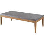 Perfect outdoor living spaces with the Chesapeake Cocktail Table, showcasing a smooth gray stone top which is offset by a natural wooden base.
