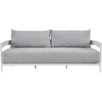 The South Beach Sofa introduces a casual elegance to outdoor living spaces with light gray oversized seat cushions perfectly complemented by a fresh white-hued aluminum body with subtle curvature.