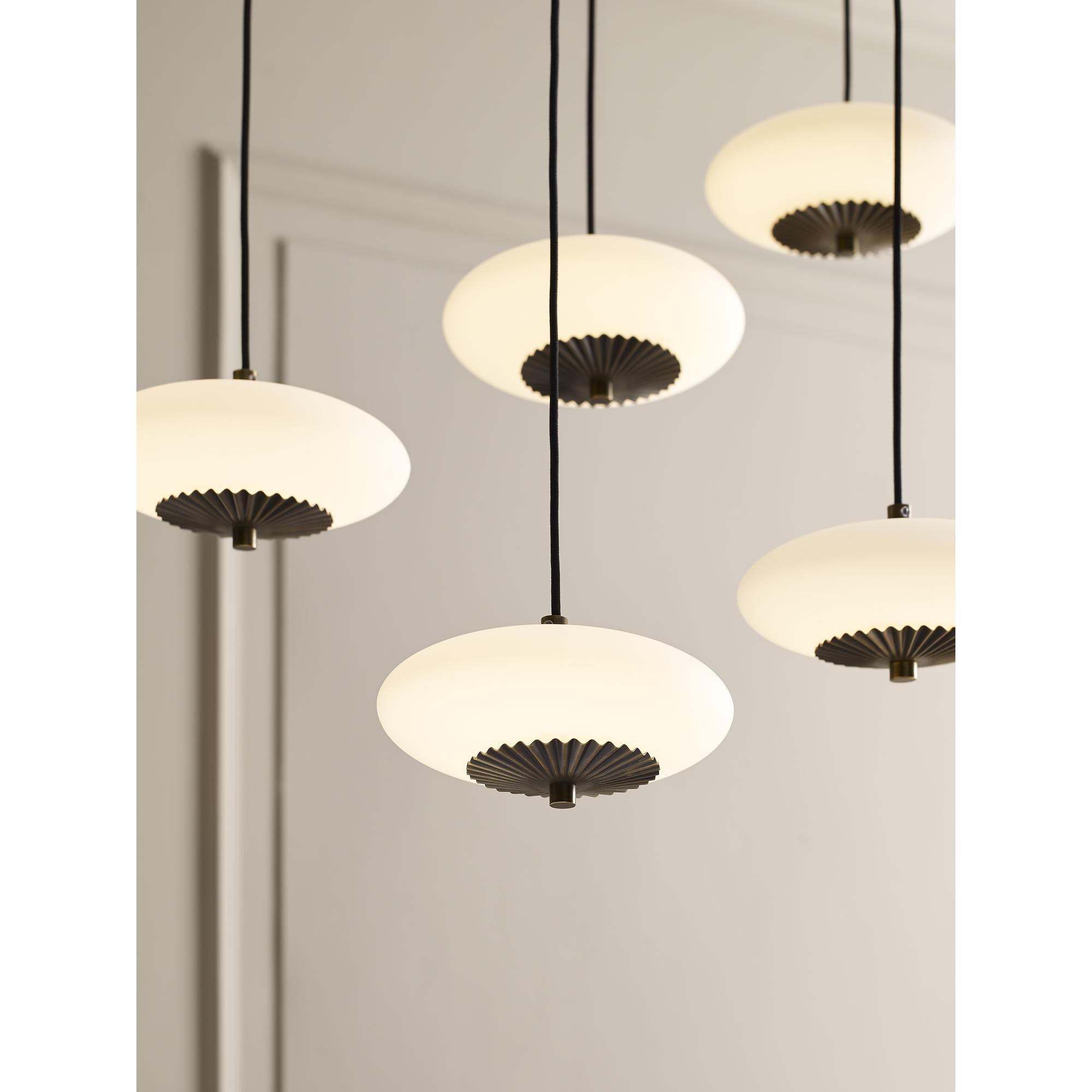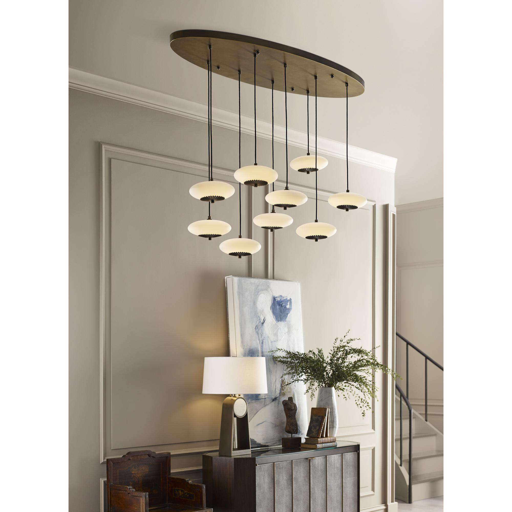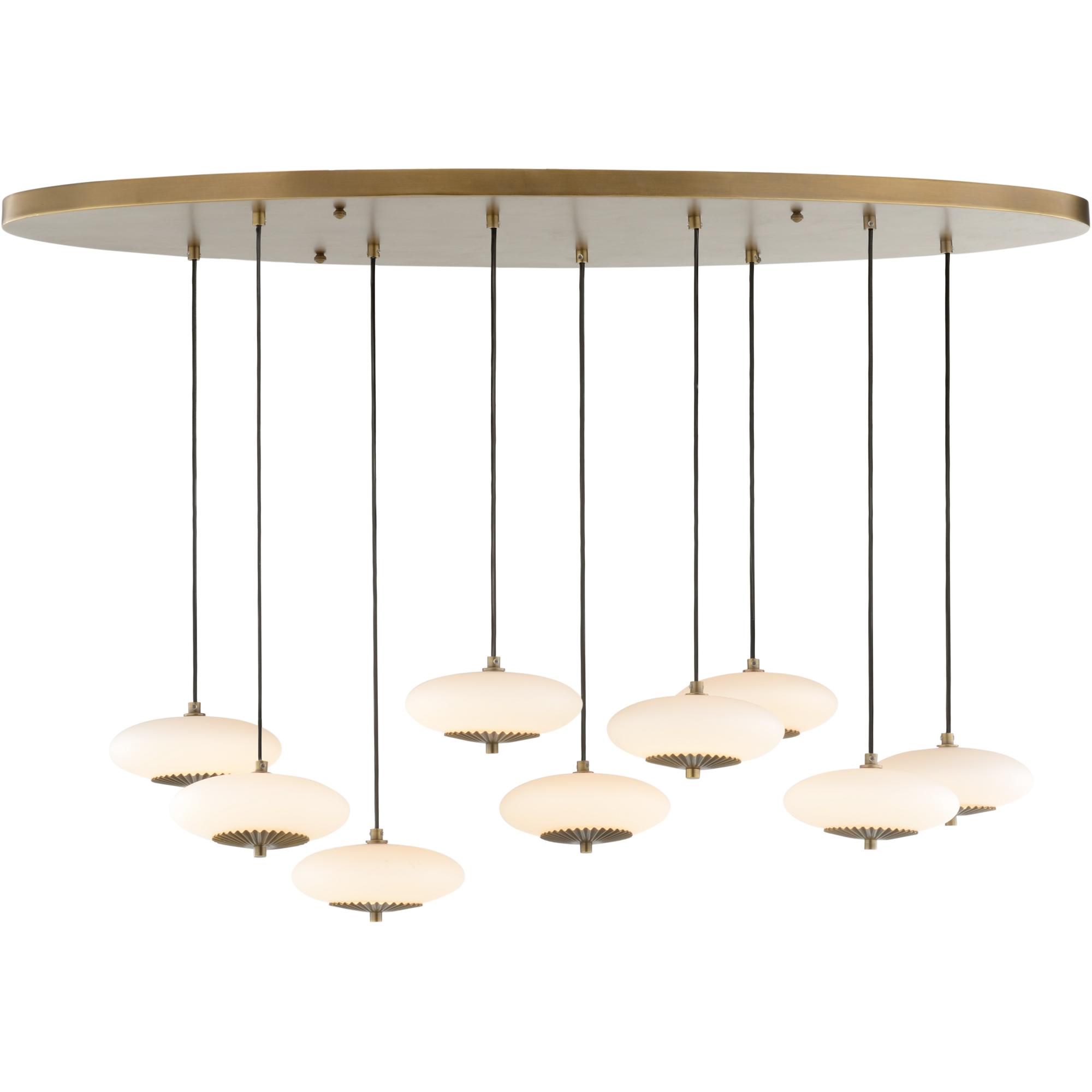 A thoughtful mix of feminine elegance partnered with a modern sensibility; the Collier Chandelier is a statement-making multi-drop fixture. Pleated brass accents highlight milk glass spheres suspended from adjustable height cords offer flexibility across a myriad of applications.