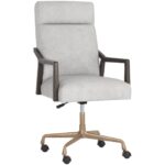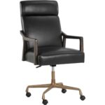 Create a distinguished workspace with the handsome Collin office chair. The exposed oak wood arms and brushed gold base offers an airy element while paired with shalimar tobacco leather. Handle with Care: This design has been crafted with 100% top grain leather. Leather is a natural material; as such, colour variations, markings, wrinkles, grooves and light scratches are acceptable and appreciated characteristics. No two pieces are alike. Visit our Product Care page for more information on how to ensure the lasting beauty of this piece. As wood is an organic, porous material, these pieces will contain natural variation of texture and may also exhibit fine indentations and cracks. Wood pieces will also display a disparity of colour and grain, and visible knots and burls that add to the character of each piece.