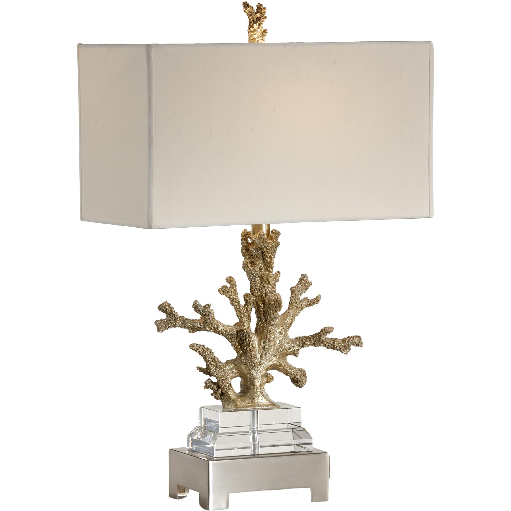 Bring a piece of the ocean into your home with our Coral Colony lamp. A hand finished champagne faux coral casting with a brushed brass and crystal mounting combine to create an elegant piece of art. The off white rectangular silkette shade diffuses the light for a soft glow. Ideal for a console or end table in your coastal living area.