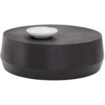 A large, captivating coffee table with an alluring bronzed gunmetal finish. Features a hand-etched and hand-hammered top with a drum style base. This piece will add a contemporary flair to living, lounge and office spaces. Also available in a small version, along with a coordinating side table. Made in India. With refined craftsmanship, this design was brought to life by skilled local artisans. Due to the nature of handcraftsmanship, unique imperfections such as fissures, markings and variations in colour and shape are welcomed and appreciated characteristics for a truly one-of-a-kind piece.