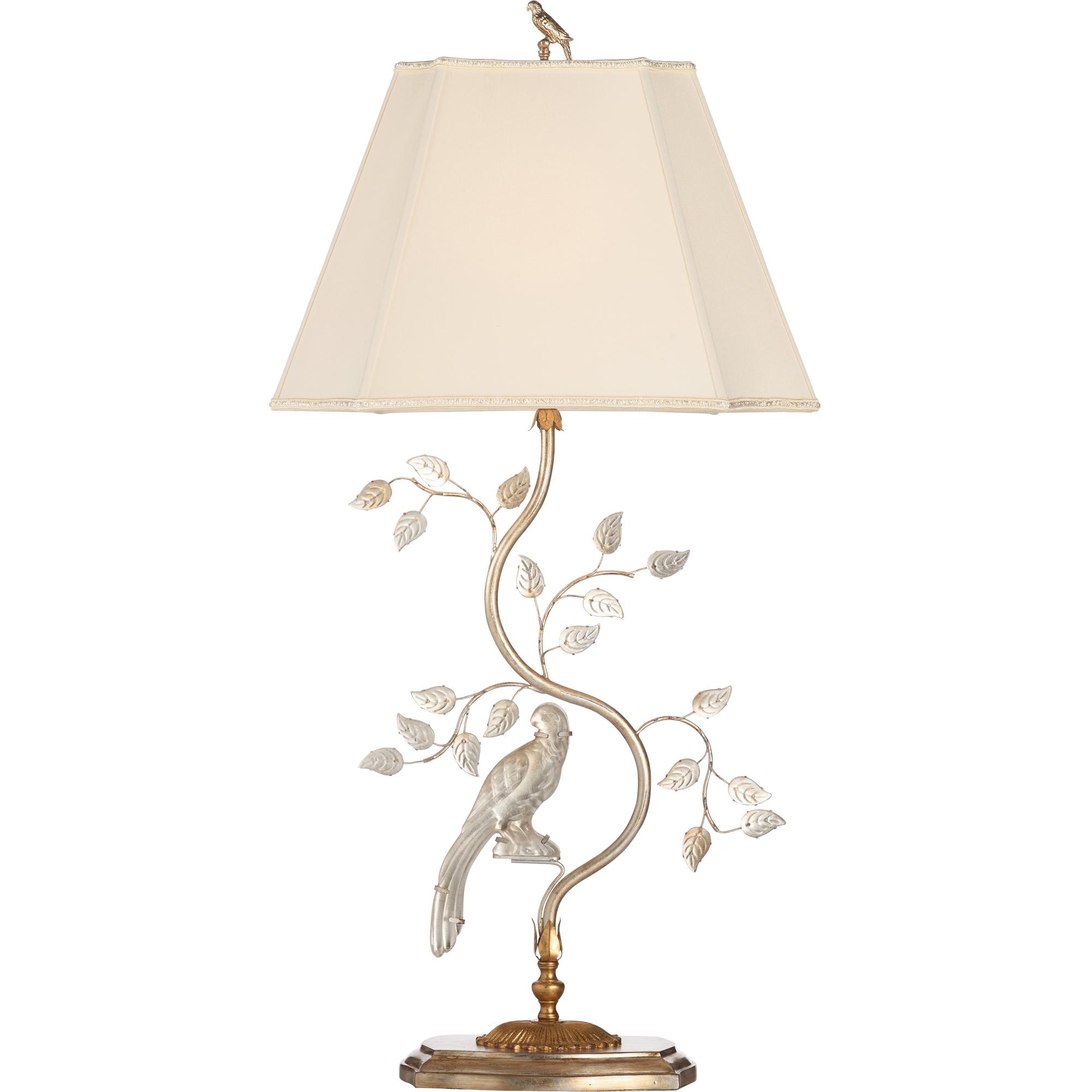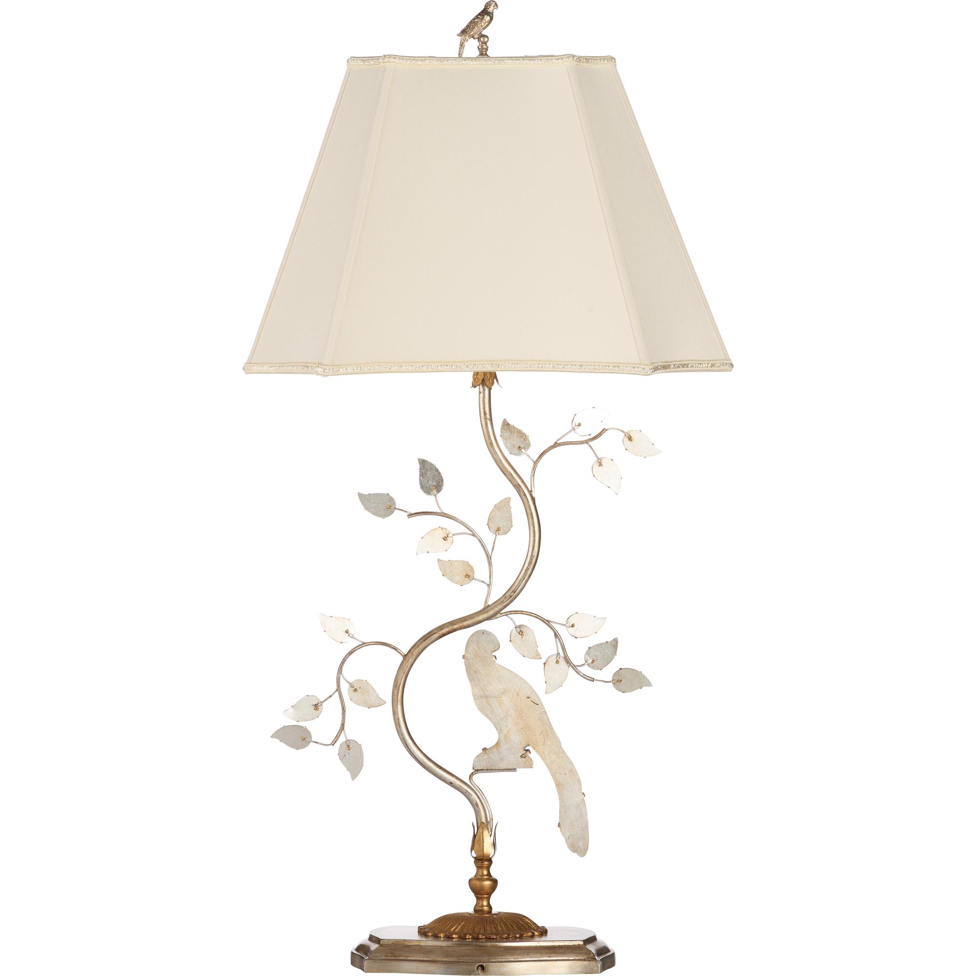 This exquisite lamp combines shimmering crystal and refined metalwork, featuring a delicate bird perched among intricately crafted leaves and finished off with a delicate bird finial. A harmonious blend of nature-inspired elegance and timeless luxury, it brings a touch of enchantment and beauty.