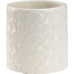 Sophisticated ceramic cachepot in white glaze with intricate decorative design.