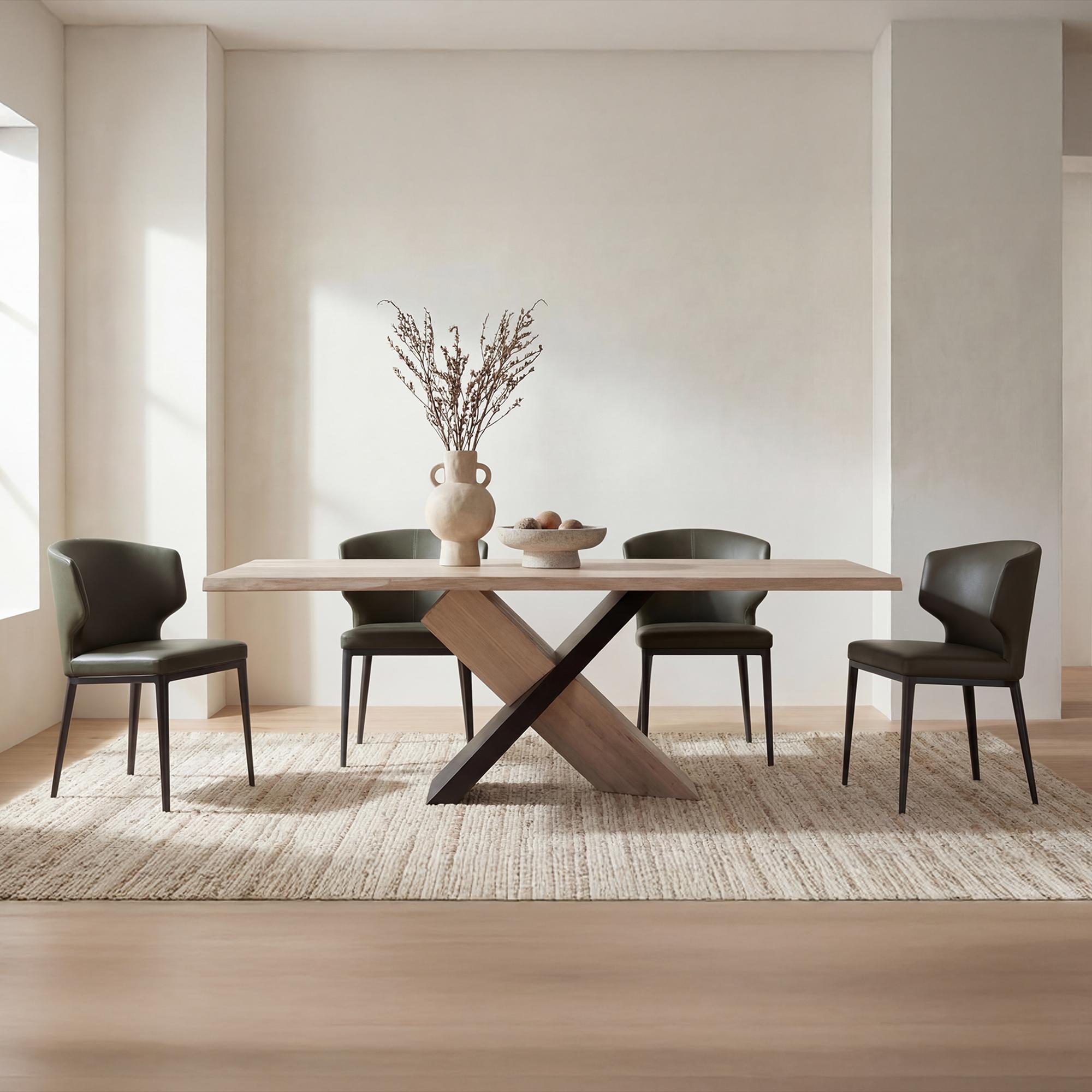 The Delaney dining chair’s hourglass silhouette is full of Art Deco allure. This eye-catching accent elevates the dining experience while blending seamlessly into any interior. Dressed in easy-to-clean vegan leather upholstery with an ultra-soft foam seat, this piece adds a touch of glamour without compromising comfort.