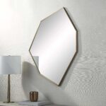 Geometric influences take the spotlight in this contemporaru glass mirror design. With strong angles and an artistic structure, this piece serves as a work of art in the home – in addition to providing everyday function. The mid-size dimensions make this satin brass framed mirror perfect for hanging above a prominent piece of furniture, be it a bench, sofa or entryway table.
