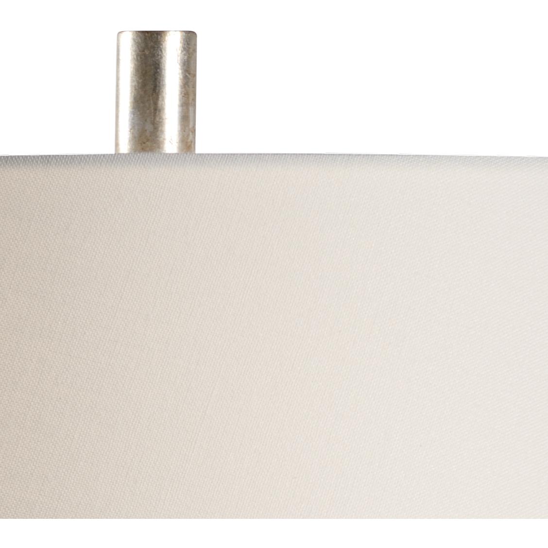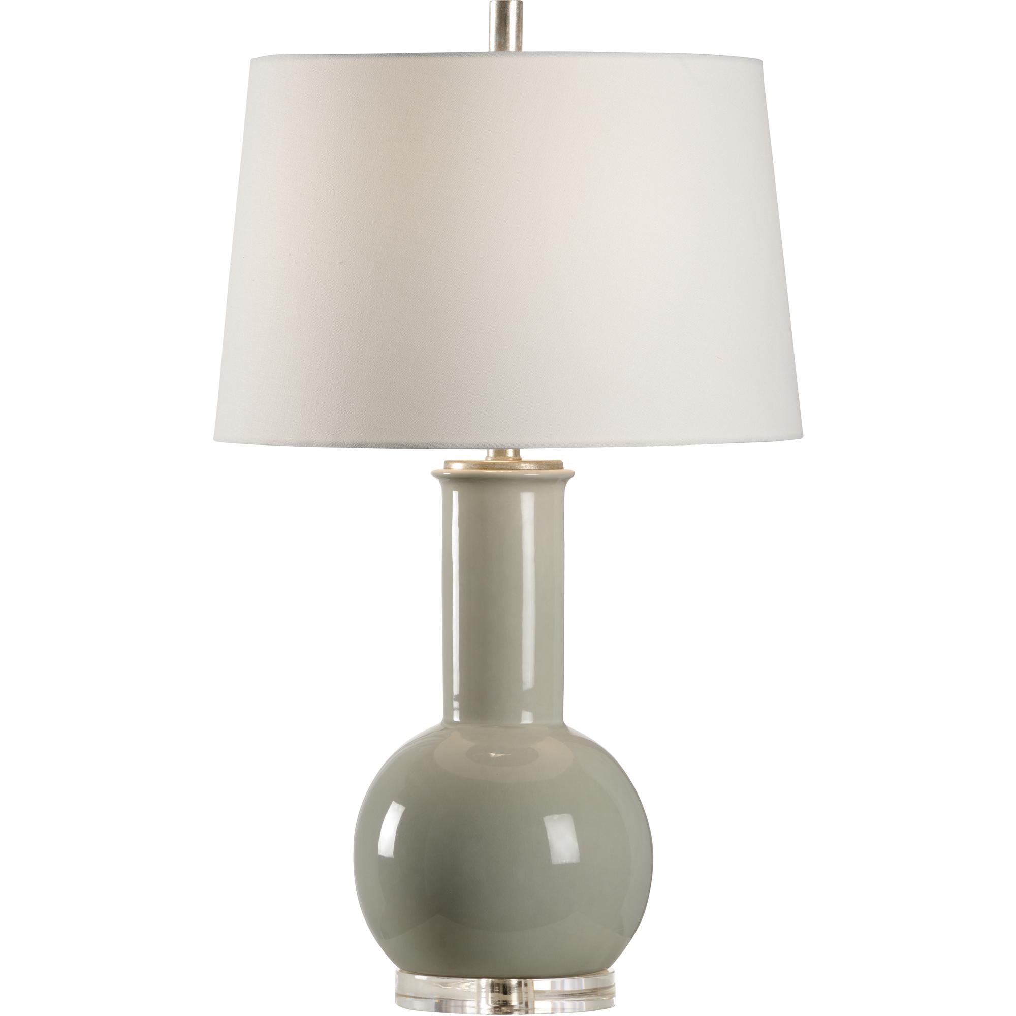 Provide accent lighting with this modern bottle style table lamp. A soothing sage green glazed ceramic with silver leaf neck and finial is mounted on a clear acrylic base. The off white linen tapered drum shade completes the look and adds a hint of elegance to the transitional design.