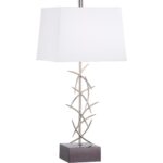 Crafted of stainless steel, diez lamp features contrasting black and polished nickel finishes that combine to create a transitional design. It is topped with a square, white shade thar hides the light source as it reflects off of the sleek finish providing ambient light throughout any space..