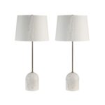 Put this marble and champagne-plated set of two stunning table lamps on your must-have list for rooms that crave symmetry and style. Ivory shades diffuse soft, dimmable light making this duo of lamps perfect for illuminating and elevating any interior. Feature them as part of an eye-catching vignette, or as simple yet stylish light sources in your next design project.