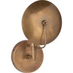 The Dovi is made of unlacquered brass, with an antique brass round shield one arm sconce. The Dovi design is inspired by the streetlamps found on the streets of Italy. Can be installed as pictured, or upside down.