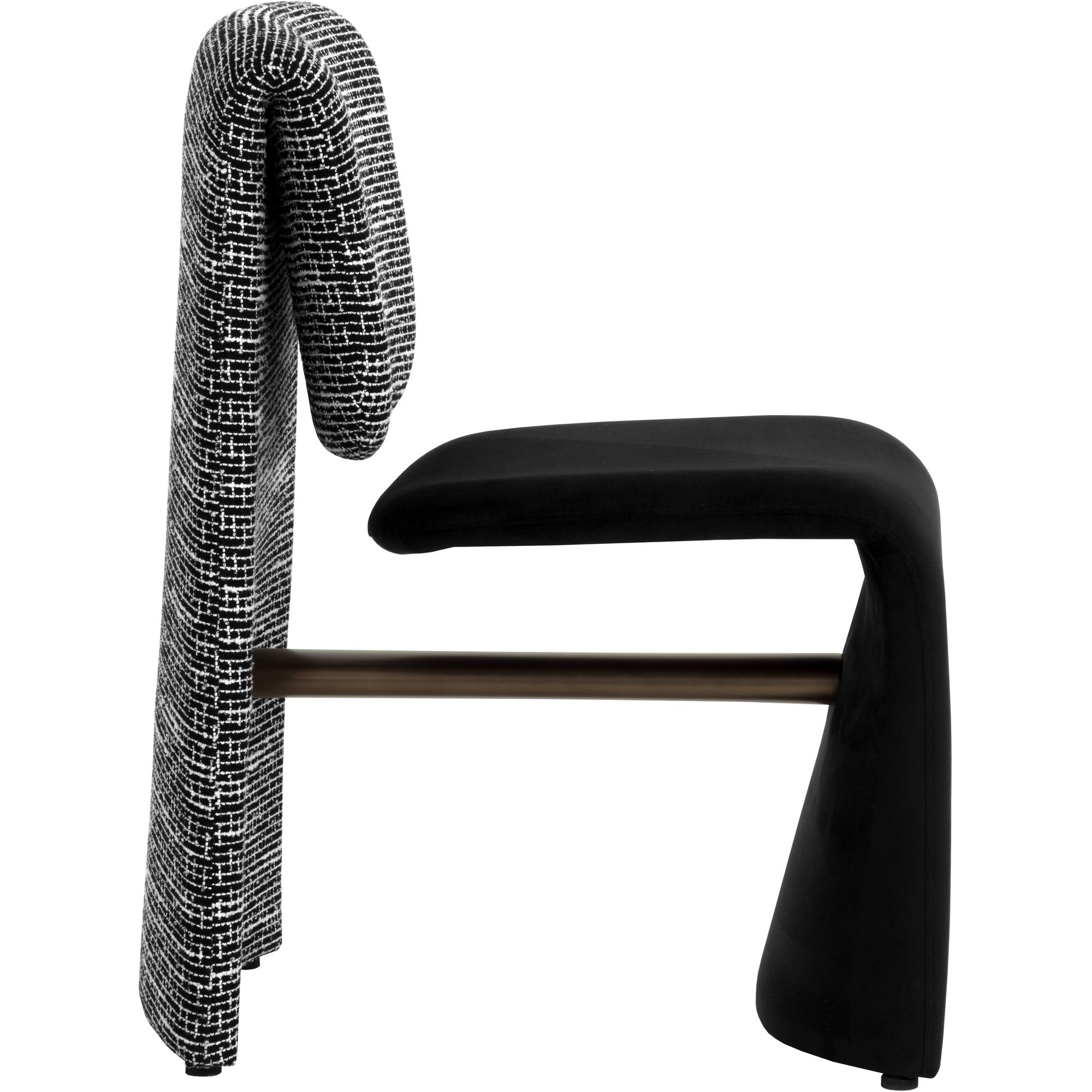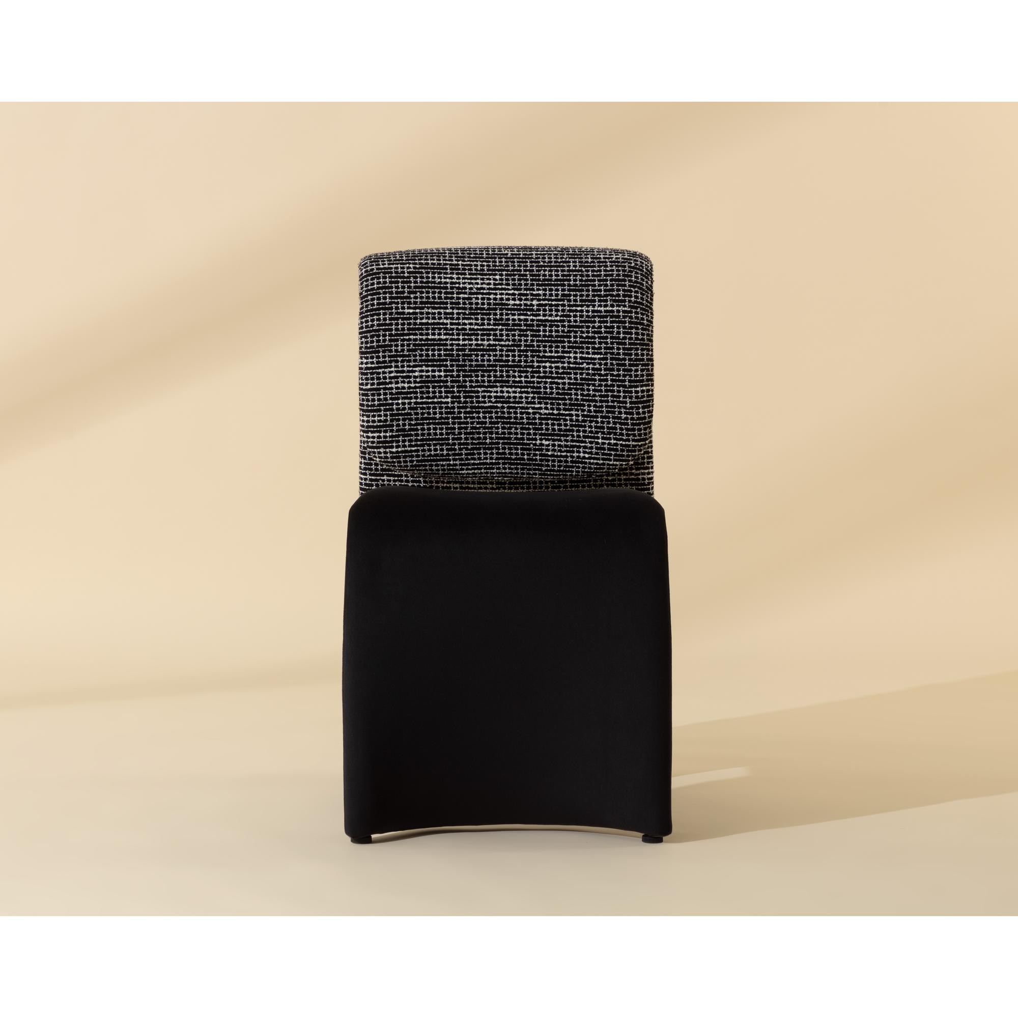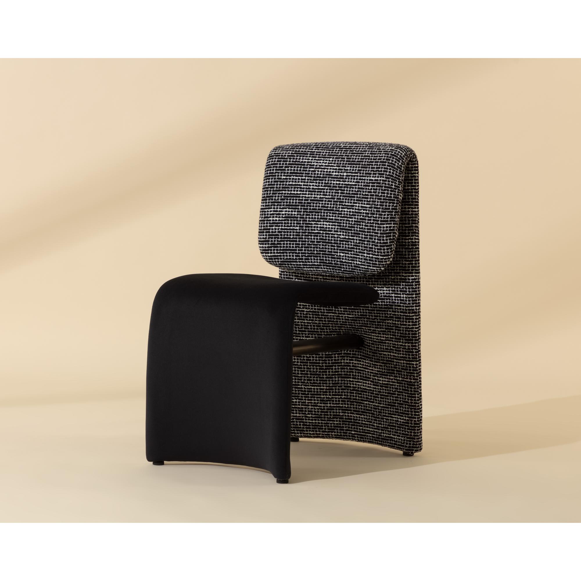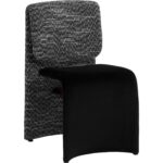 Like a quiet mirage, the Dunnington Dining Chair plays with contrast and perception. The upholstery shifts between a velvety smooth abbington black on the seat and the nubby textured hobbes night fabric on the backrest. A discreet metal support beneath the seat offers balance and structure.