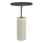 A white marble base soars up to a black marble surface, with rose gold connecting the two. A luxurious and exquisitely designed modern accent table for your living space.