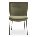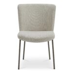 The Early dining chair is an elegant fusion of minimalist design and comfort that features a slim metal frame in a blackened bronze finish. Its seat and comfortably curved back are upholstered in durable, easy-to-maintain Performance fabric. It complements any dining setting, especially alongside wooden tables, presenting a clean, cohesive look that invites sophisticated ease.