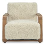 Featuring a solid oak frame finished in a warm vintage stain that highlights the natural beauty and graining of the wood, the Eckersley lounge chair draws inspiration from the past, infusing any space with rustic warmth and sumptuous comfort. While generous in its proportions, the wide, sturdy arm profile is perfectly complemented by the plush softness of faux shearling upholstery, offering an irresistibly inviting tactile experience.