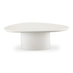 The Eden coffee table features a rounded triangular shape and oval pedestal base, creating a sculptural silhouette that exudes modern sophistication. An ivory white and black high gloss finishes this coffee table’s surface, reflecting light, brightening and opening up any space.