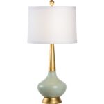 Light up your living room or bedroom with this eye catching mid century modern table lamp. Featuring a celadon glazed porcelain with a curved silhouette, the Eden Lamp has an antique brass finished elongated neck and mount that shine under an off white linen shade.