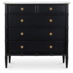 Inspired by the everyday grace of Provence style, the Eleanor 5-drawer chest showcases a classically graceful profile with distinctive turned details. Crafted from Mango wood, this piece is crowned with an expressive marble top and finished with solid antique finished brass finish handles, adding a touch of timeless sophistication and natural beauty.