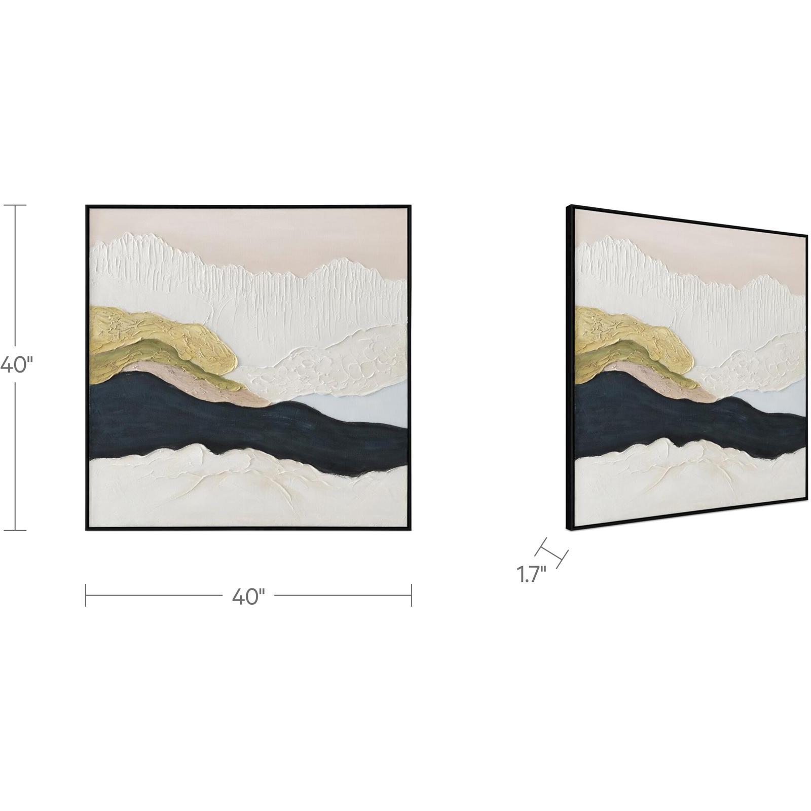 Neutrals meet dimension. Elevate is all about texture, the quiet kind that pulls you in. This abstract landscape blends cool tones with warm greens and beiges, building depth through layering rather than detail. Softly structured and washed in a neutral palette, it brings atmosphere without overwhelm. Minimal in form, but full of feeling, the kind of piece that makes a space feel more lived-in, in the best way.