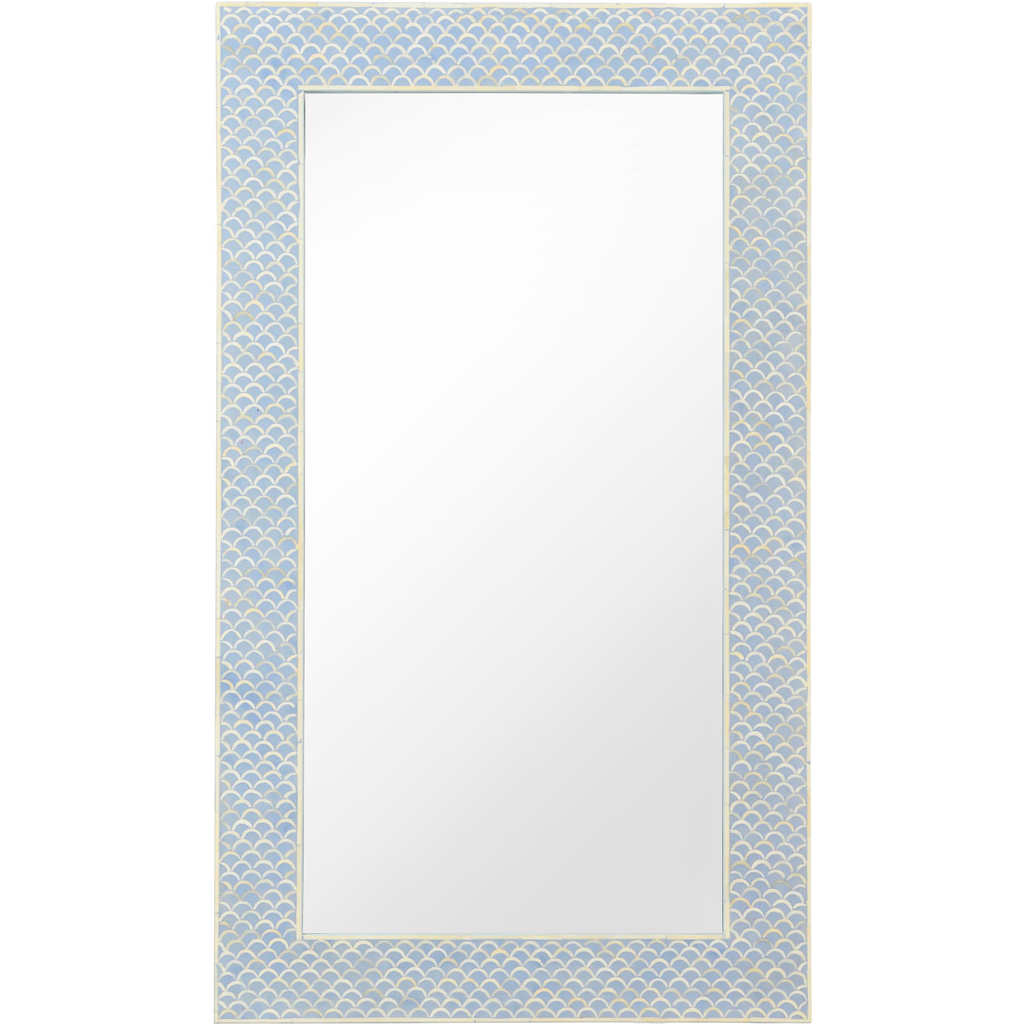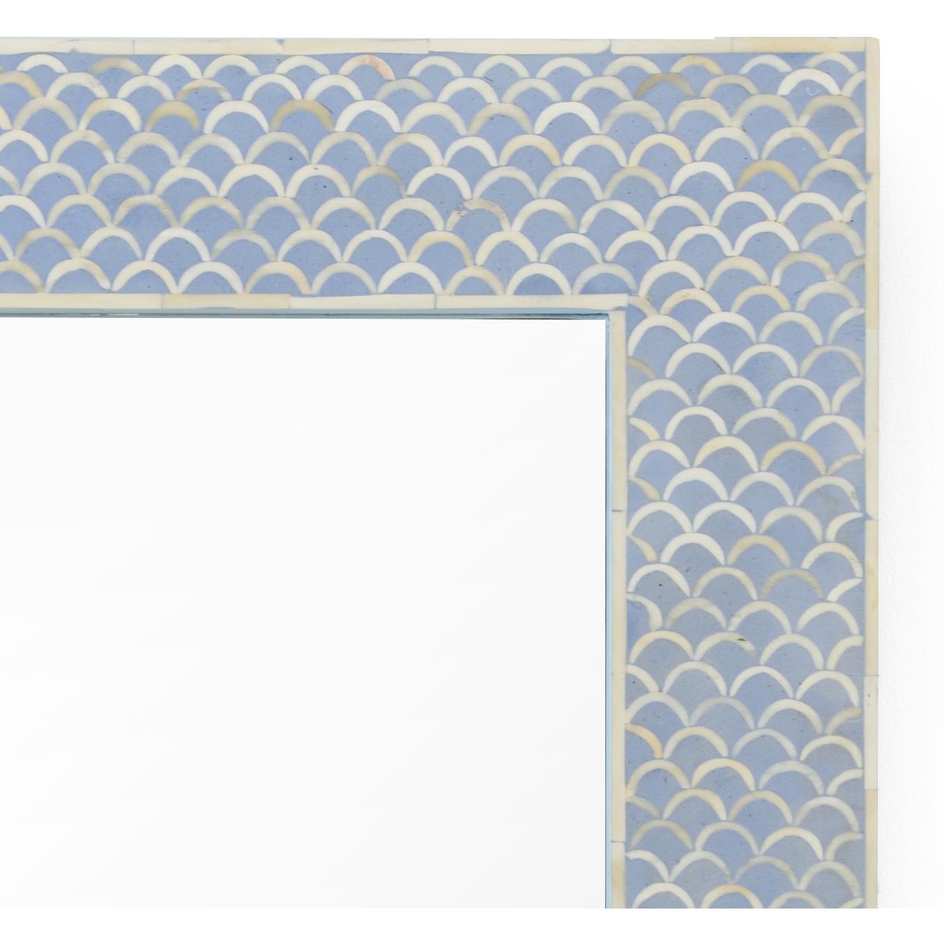 Create an eye catching focal point in an entryway, hallway or powder room with elgon mirror. This rectagular accent mirror features an intricate pattern of blue and cream bone that has been hand layed by skilled artisans. Due to the sophisticated artistry each mirror has natural characteristics that make it unique.