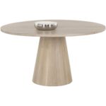 A classic round dining table that takes inspiration from modern mid-century design for a tasteful addition to any dining space. Made from natural solid oak wood with a whitewash finish. As wood is an organic, porous material, these pieces will contain natural variation of texture and may also exhibit fine indentations and cracks. Wood pieces will also display a disparity of colour and grain, and visible knots and burls that add to the character of each piece. Made in India. With refined craftsmanship, this design was brought to life by skilled local artisans. Due to the nature of handcraftsmanship, unique imperfections such as fissures, markings and variations in colour and shape are welcomed and appreciated characteristics for a truly one-of-a-kind piece.