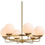 Elevate any space with this modern chandelier that is guaranteed to add brightness in a stylish manner. Features six white frosted glass shades in a metal wheel frame with a brass finish.